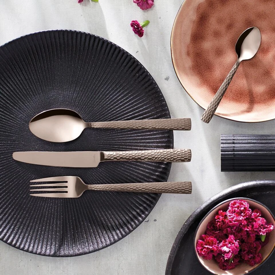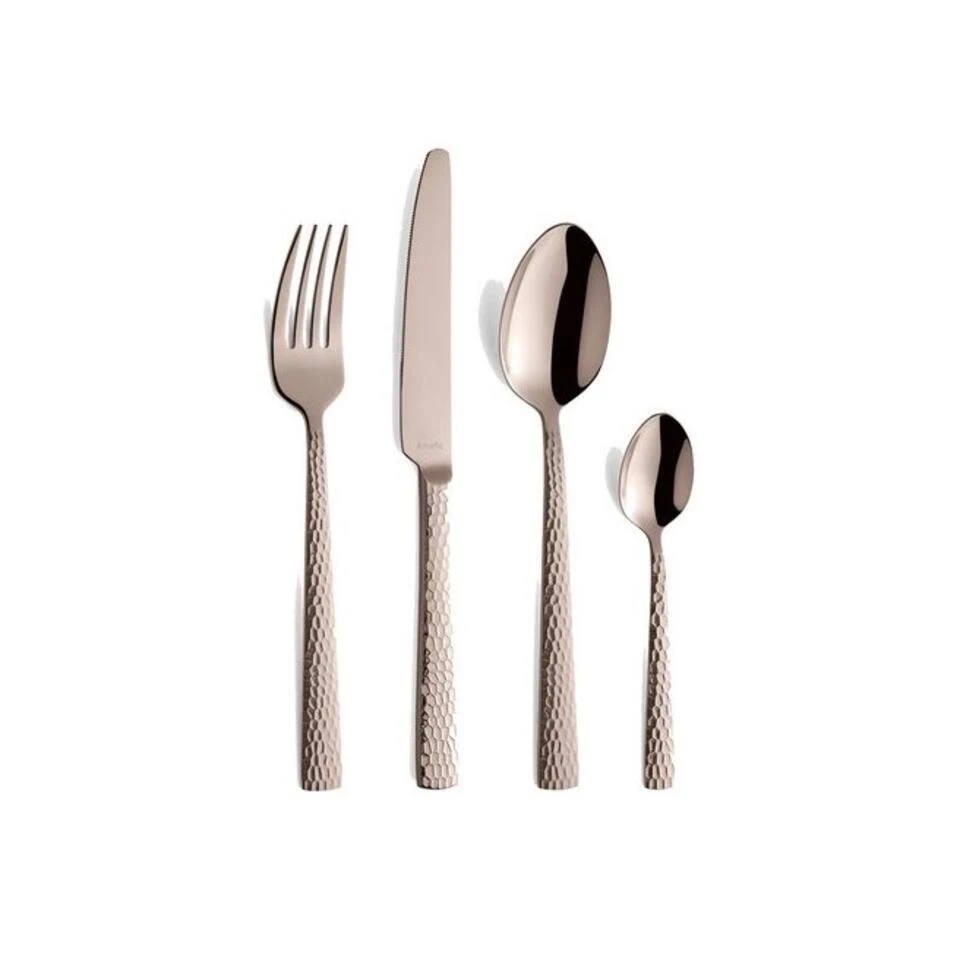 Felicity bestek van Amefa brengt het gevoel van eigentijds handwerk op tafel door de grove, gehamerde decoratie op het heft. De gekleurde hoogglans afwerking geeft een stijlvolle en moderne twist aan elke tafelsetting. De gehamerde decoratie op het handvat zorgt voor een mooie reflectie op het bestek waarbij de glans perfect tot zijn recht komt.<br><br>Deze 24-delige bestekset bestaat uit:<br><br>