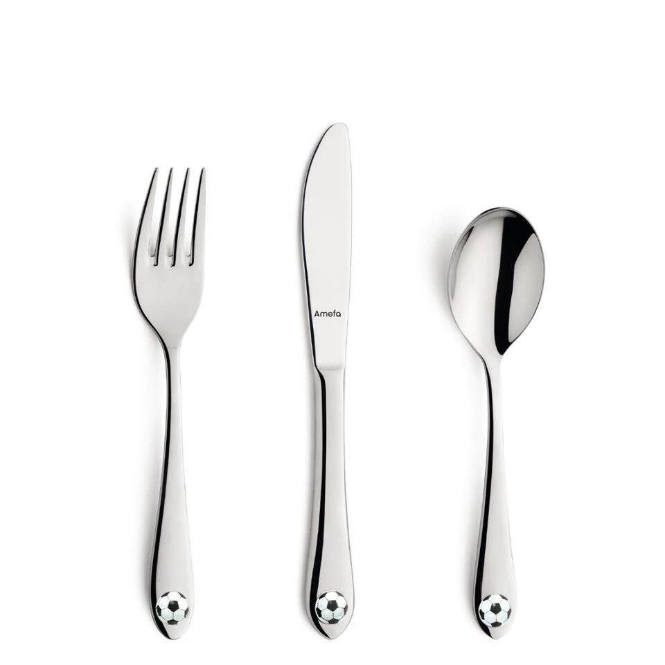 Het 3-delige Amefa kinderbestek Footie is speciaal bedoeld voor jonge kinderen, die trots kunnen zijn op hun eigen bestek. Op alle delen staat een afbeelding van een voetbal. De normaal scherpe delen van het mes en de vork zijn afgerond zodat de het veilig te gebruiken is voor de kleine tafelgenoot.
