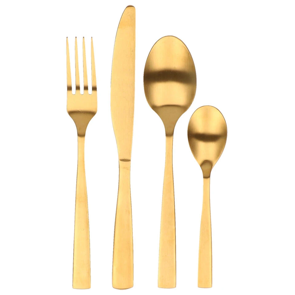 Bestekset 16-delig mat goud voor 4 personen. Deze 16-delige bestek set bestaat uit 4x vorken, 4x lepels, 4x messen en 4x theelepels en is geschikt voor 4 personen (4 couverts). Materiaal: RVS. Kleur: mat goud. Vaatwasmachinebestendig: Nee, handafwas wordt aangeraden voor een langdurig behoud van de kleur.Tafelbestek voor ontbijt, lunch en diner.