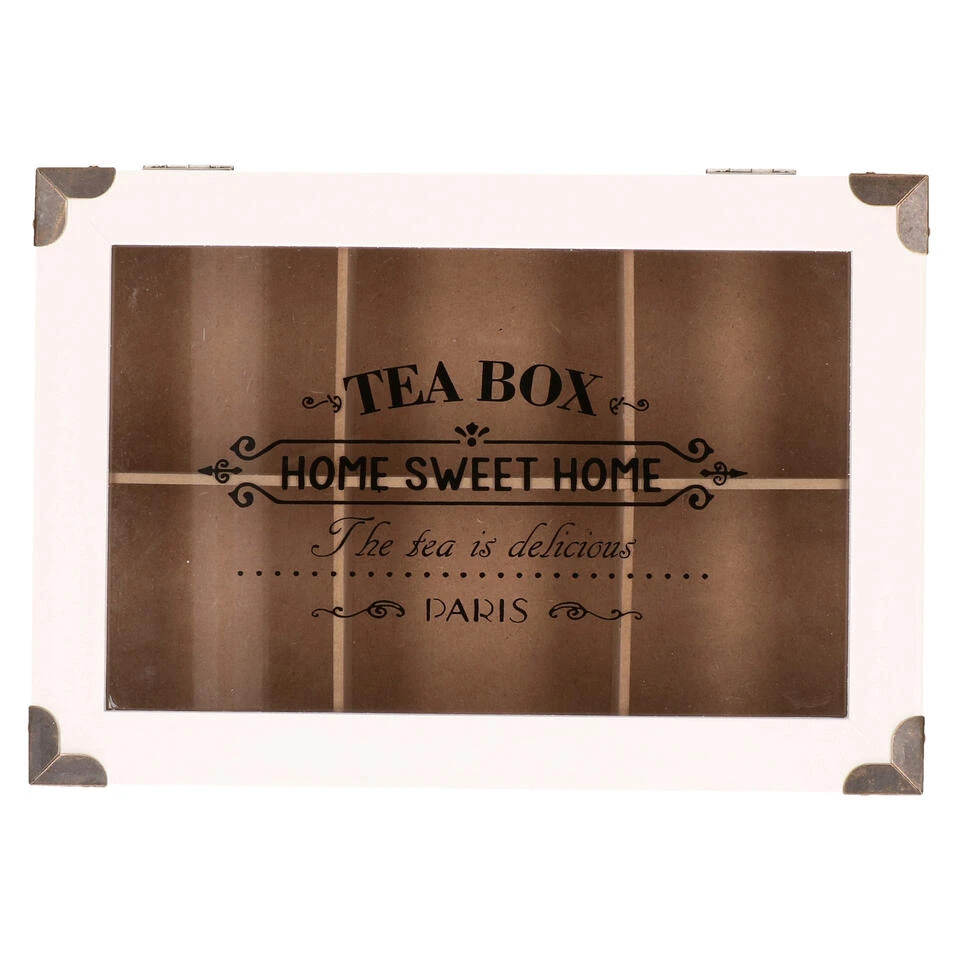 Houten theedoos/theekist bruin/wit met 6 vakken 24 x 16 x 7 cm. Vierkante 6-vaks theedoos voor het bewaren van diverse soorten thee/theezakjes. Met doorzichtig deksel met witte rand, metalen hoekbeslag en onder andere de teksten ‘Boite a The’ en ‘Home Sweet Home’ op het glazen deksel.