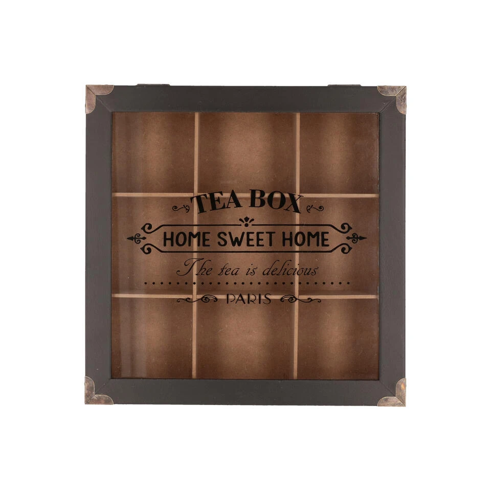 Houten theedoos/theekist bruin/zwart met mdf bodem met 9 vakken 24 x 24 x 7 cm. Vierkante 9-vaks theedoos voor het bewaren van diverse soorten thee/theezakjes. Met doorzichtig deksel met witte rand, metalen hoekbeslag en de teksten ‘Teabox’ en ‘Home Sweet Home’ op het glazen deksel.