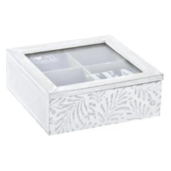 Theedoos/theekist model Leaves in de kleur wit met 4 vakken. Afmetingen: 19 x 19 x 7 cm. Materiaal: mdf hout en glas. Voor het netjes bewaren van diverse soorten thee/theezakjes. Met doorzichtige deksel. Decoratie print op de zijden. Standaard theezakjes passen rechtop in deze theedoos, groter verpakte zakjes kunnen vaak wel schuin in een vakje geplaatst worden.