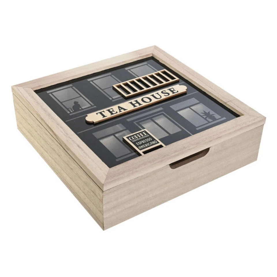 Theedoos/theekist model Vintage Tea House in de kleur lichtbruin met 9 vakken. Afmetingen: 24 x 24 x 7 cm. Materiaal: mdf hout en glas. Voor het netjes bewaren van diverse soorten thee/theezakjes. Met doorzichtige deksel. Decoratie print op de zijden. Standaard theezakjes passen rechtop in deze theedoos, groter verpakte zakjes kunnen vaak wel schuin in een vakje geplaatst worden.