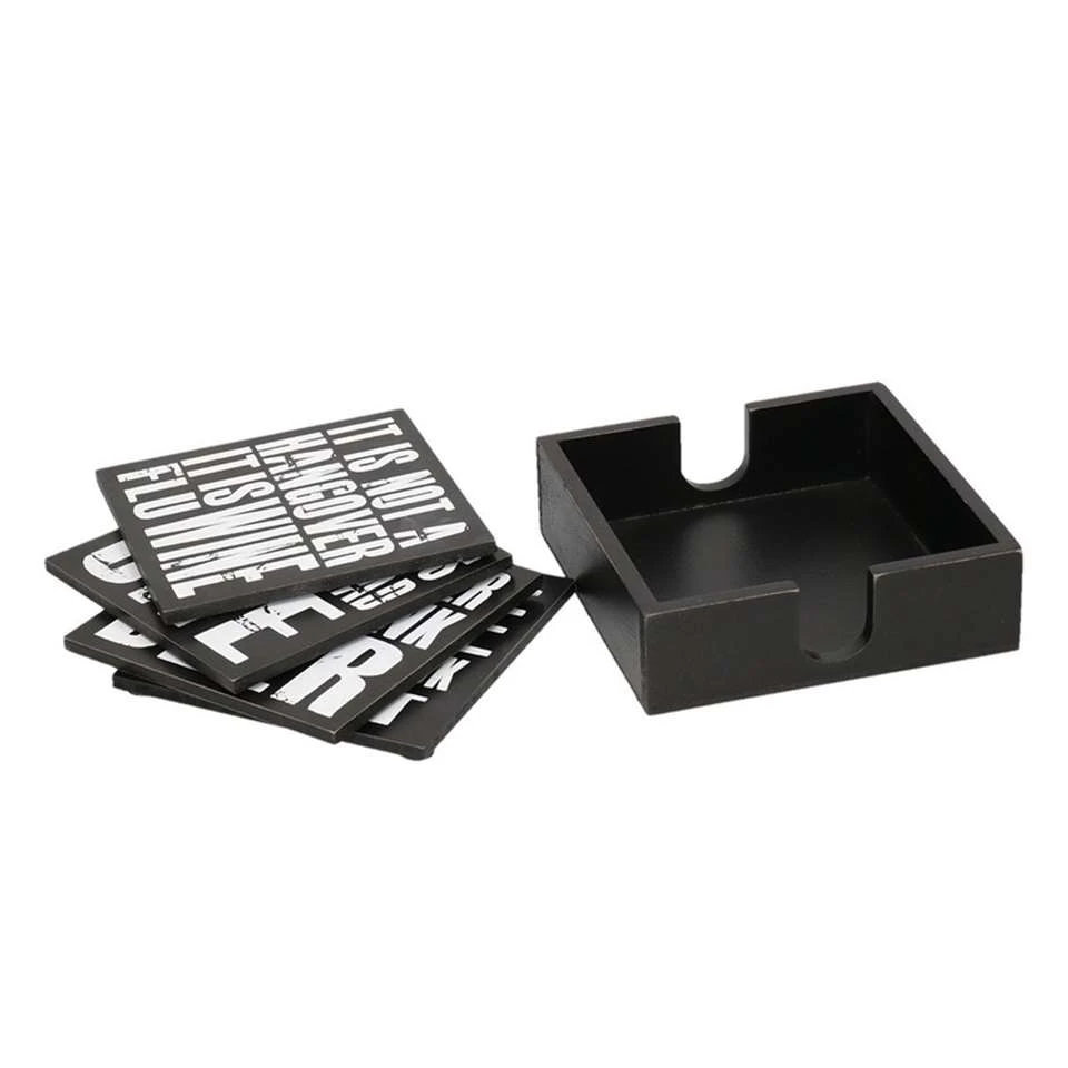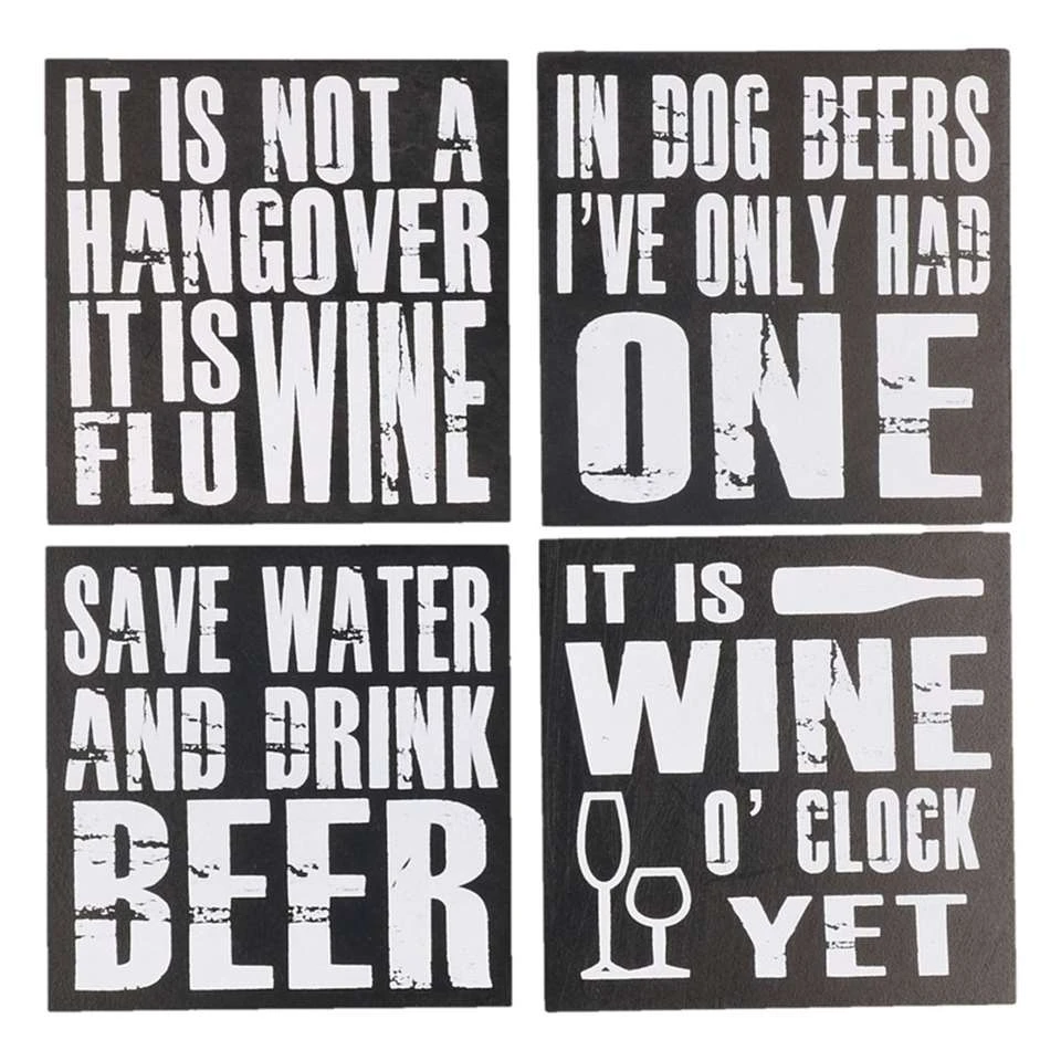 4x Houten onderzetters zwart met tekst. Deze set met zwarte onderzetters hebben een wit geschreven tekst, gerelateerd aan bier en wijn. Materiaal: hout. Afmeting onderzetter: 10,5 x 0,5 x 10,5 cm. Afmeting houder: ca. 12 x 3,5 x 12 cm.