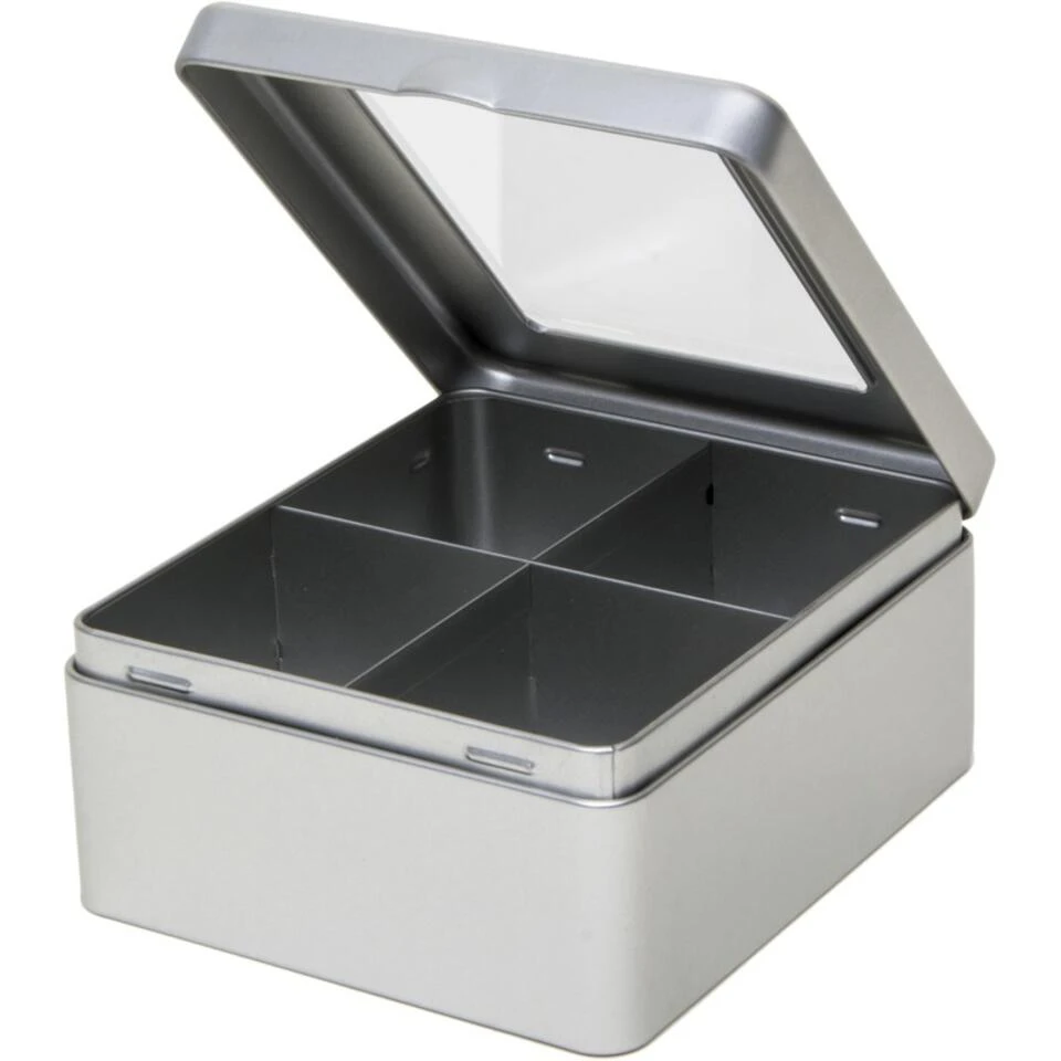 Zilveren 4-vaks theedoos/theekist 15 cm aluminium. De theekist is gemaakt van aluminium en heeft een transparant kunststof venster/raam aan de bovenzijde. Materiaal: aluminium (metaal), kunststof. Formaat: L15,5 x D13,5 x H7 cm. De theedoos is geschikt om theezakjes van 6,5 cm rechtop neer te zetten. Inhoud: 1,46 liter. Theedozen/theekisten aluminium opbergblikken/bewaarblikken/voorraadblikken home deco keuken accessoires.