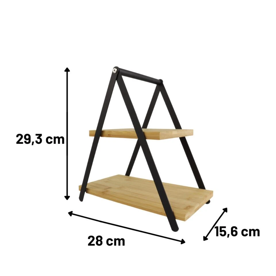 De Orange85 etagère murale maakt het serveren van hapjes stijlvol. Er is een handvat waardoor het verplaatsen makkelijk gaat. Het is gemaakt van bamboe en metaal. De afmetingen zijn 28 x 15,6 x 29,3 cm. De etagère bestaat uit 2 lagen.