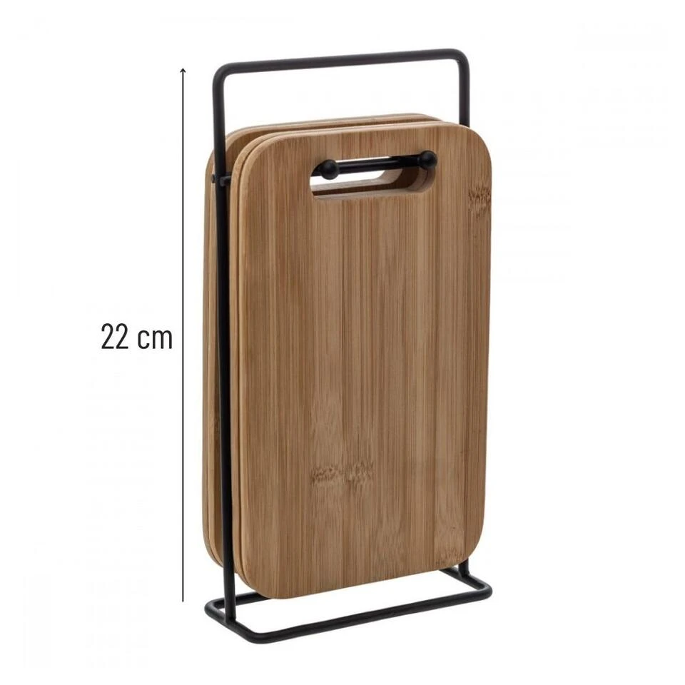 Snijplankenset met vier snijplanken en een houder van Orange85. De set bevat vier snijplanken gemaakt van bamboe. De houder is gemaakt van staal en heeft aan beide zijdes twee haakjes waar de planken aan kunnen worden gehangen. De afmetingen van de snijplanken zijn 22 x 14 x 0.7 cm.