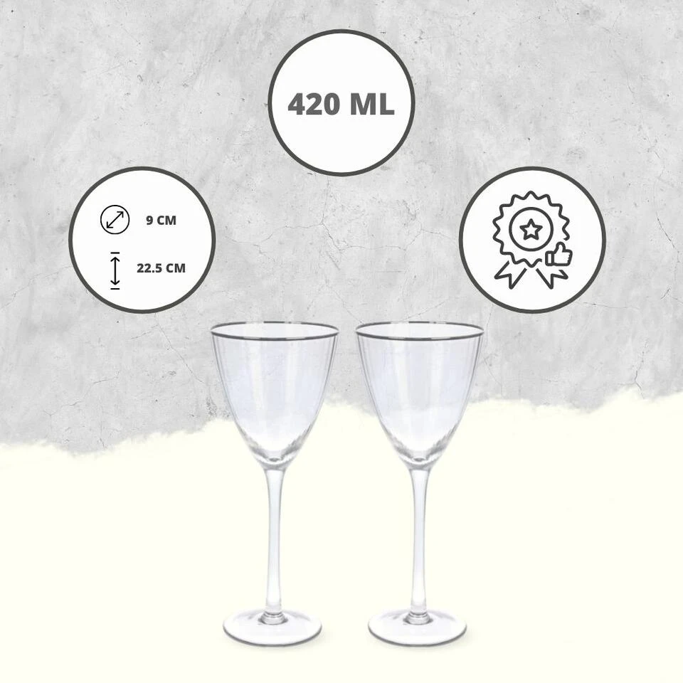 2 luxe wijnglazen van het merk Orange85. De glazen zijn afgewerkt met een luxe rand aan de bovenkant. Dit geeft ze een chique uitstraling. De inhoud is ca. 420 ml. De wijnglazen zijn niet geschikt voor in de vaatwasser. Advies is dus om deze met de hand af te wassen.