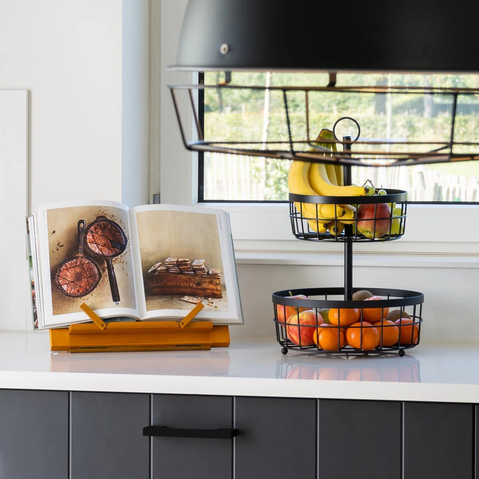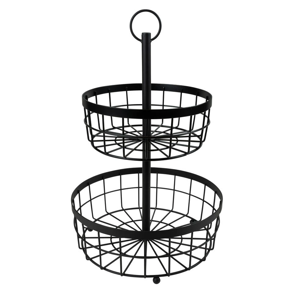 Deze fruit organizer heeft twee manden voor al het fruit. De bovenste mand is wat kleiner dan de onderste, waardoor de opberger taps toeloopt. Hierdoor lijkt de fruitschaal minder groot, terwijl het wel veel opbergruimte biedt. Het zwarte metalen frame ziet er stoer uit en is gemakkelijk te combineren met diverse woonstijlen. Zo past deze tweelaagse fruitmand perfect in een industrieel interieur, maar misstaat het ook zeker niet in een modern of Scandinavisch ingericht huis. Weet jij al waar je de fruitschaal neerzet?
