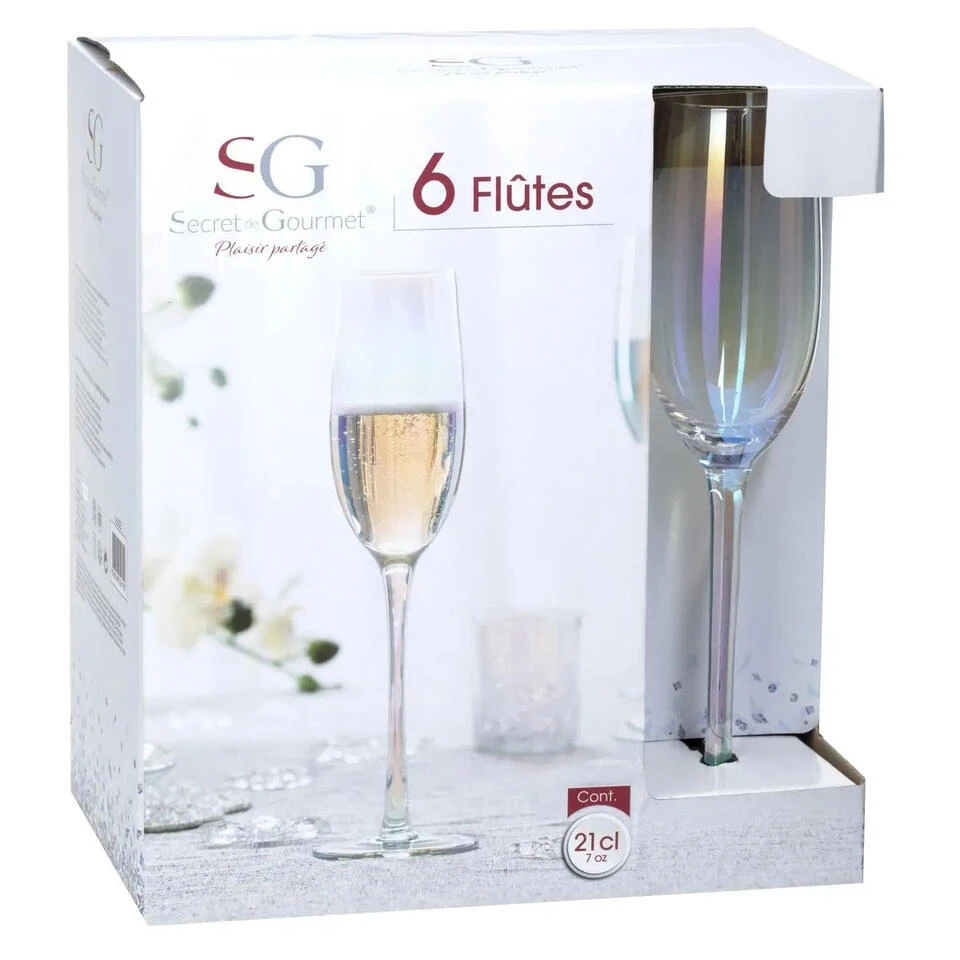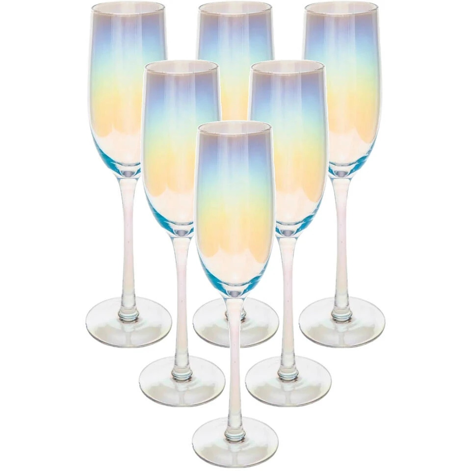 Set van 6x champagneglazen/flutes parelmoer 210 ml van glas. Afmeting: ca. D7 x H25 cm, diameter bovenkant ca 5,5 cm. Inhoud: ca. 210 ml/21 cl. Materiaal: glas. Reinigen: vaatwasser geschikt. Serie: Fantasy.